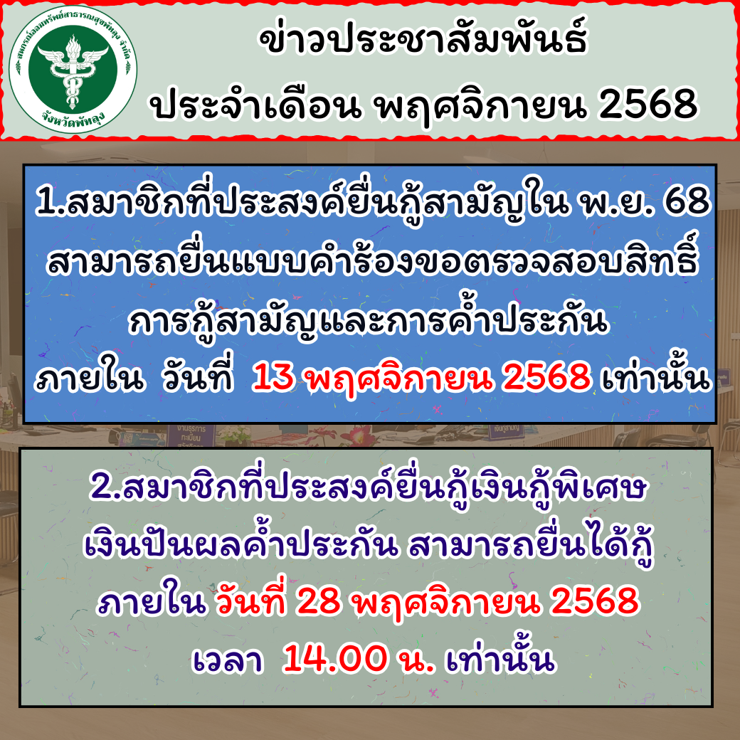 | 12 พ.ย. 2568 | ประกาศ สหกรณ์ฯ เรื่อง ปิดทำการสหกรณ์ฯ (อ่าน:31) | |