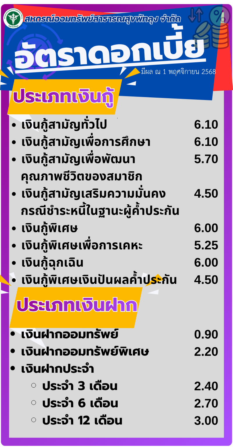 | 30 ต.ค. 2568 | ประกาศ สหกรณ์ฯ เรื่อง อัตราดอกเบี้ยเงินให้กู้แก่สมาชิก และอัตราดอกเบี้ยเงินรับฝากจากสมาชิกและสหกรณ์อื่น (อ่าน:31) | |