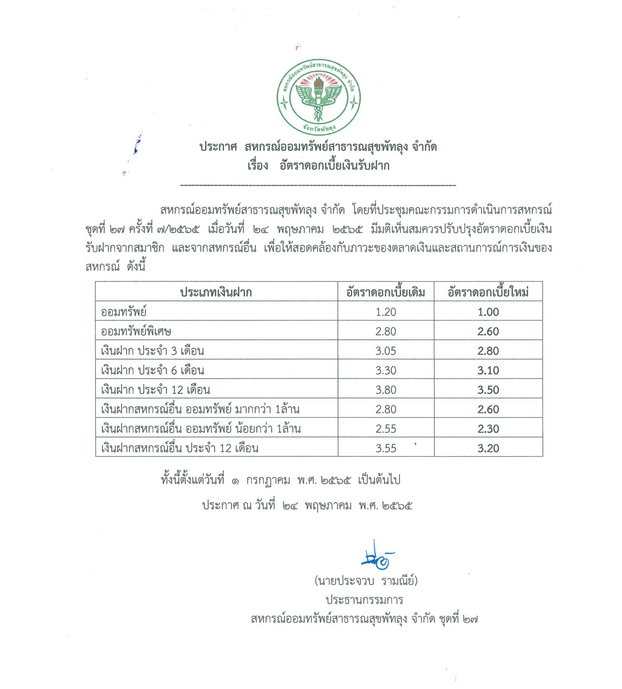 ประกาศ เรื่องอัตราดอกเบี้ยเงินรับฝาก และดอกเบี้ยเงินให้กู้แก่สมาชิก มีผลบังคับใช้ 1 กรกฎาคม 2565